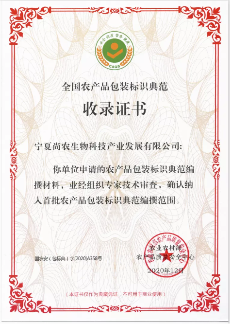 为推进农产品科学包装、清晰标识和通过包装标识全方位彰显展示农产品独有品质特性,实现农产品生产、物流、加工消费包装标识生态、环保、优质化。国家农产品质量安全中心探索在全国范围征集、编撰并发布了首批全国农产品包装标识典范。宁夏尚农生物科技产业发展有限公司等26家农产品包装标识设计、生产、物流、加工和应用单位纳入全国首批农产品包装标识典范编撰范围。