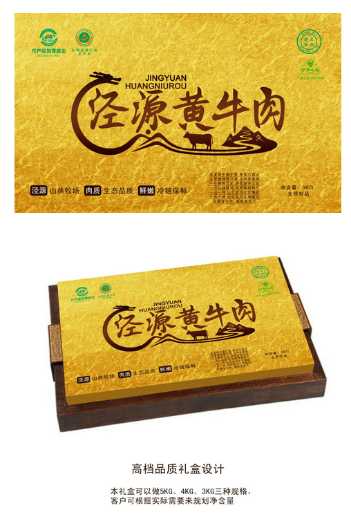 高档精品礼品盒:白卡纸、塑料膜。礼盒正面以“泾源黄牛肉”LOGO,寓意:千百年来,坚韧朴实的泾源人依托绿水青山,形成了牧养黄牛的优良传统;具有六盘山农耕文化、本土地域文化和生态品质等。右边图突出六盘山下黄牛养殖。