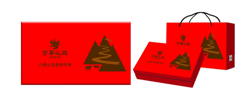 整体礼盒以白板纸制作,表面覆有塑料膜,手提袋以白卡纸制作,里面覆盖塑料膜具有防潮耐用特性。颜色以红色为主,红色是最古老的颜色,也是人们最早命名的颜色,红色看起来就像是“最具象的颜色”。在过年及中国重要节日中,更加喜庆,美观,更具代表。想起“中国红、红色六盘”,当然忘不了六盘山下的泾源黄牛肉。
