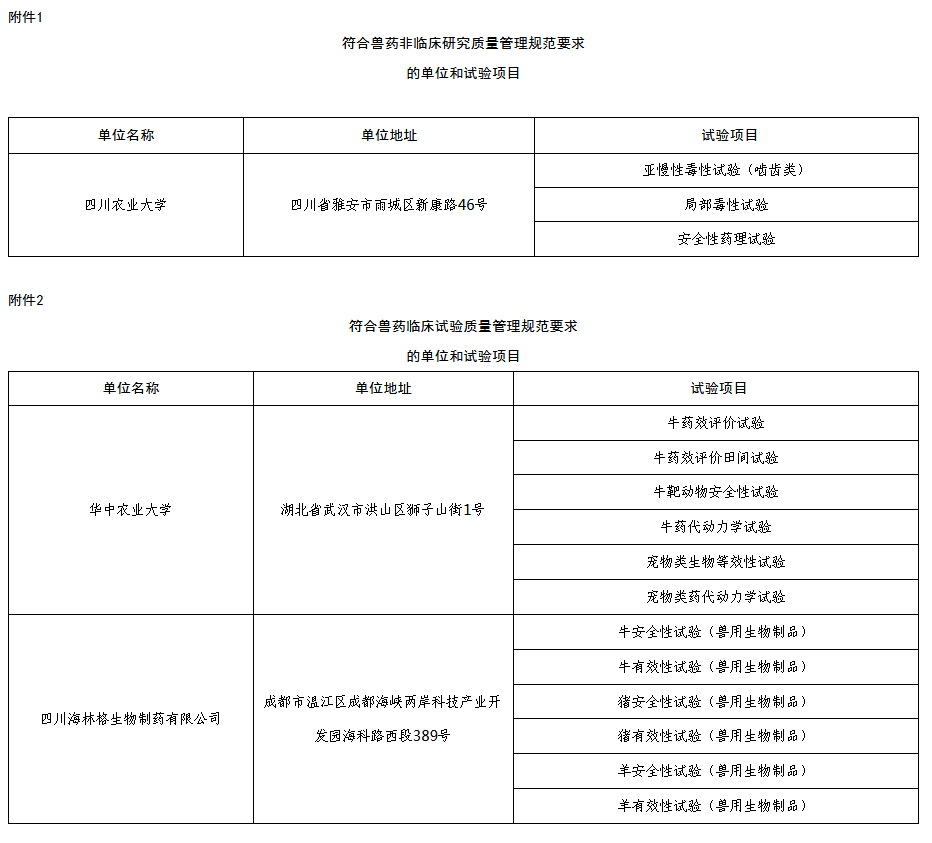 附件:1.符合兽药非临床研究质量管理规范要求的单位和试验项目