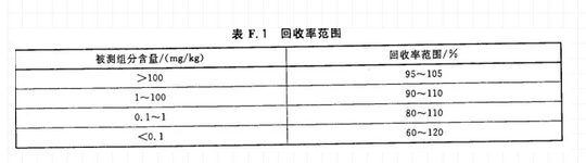 对于食品中的禁用物质,回收率应在方法测定低限、两倍方法测定低限和十倍方法测定低限进行三水平试验;对于已制定最高残留限量(MRL)的,回收率应在方法测定低限、MRL、选一合适点进行三水平试验;对于未制定MRL的,回收率应在方法测定低限、常见限量指标、选一合适点进行三水平试验。回收率的参考范围见表F.1.