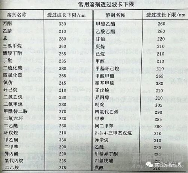 紫外吸收(UV)检测器是目前HPLC应用最广泛的检测器。其工作原理是朗伯-比尔定律。这种检测器灵敏度高,线性范围宽,对流速和温度变化不敏感,可用于梯度洗脱分离。紫外吸收检测要求被检测样品组分有紫外-可见光吸收,而使用的流动相无吸收,或在被测组分吸收波长处无吸收。一般选择在欲分析物有最大吸收的波长处进行检测,以获得最大灵敏度和抗干扰能力。在没有最大吸收时,可采用末端吸收。检测波长的选择除取决于待测物质的成分和分子结构外,还必须考虑流动相组成、共存组分干扰等因素。特别是各种溶剂都有一定的透过波长下限值,超过这个波长,溶剂的吸收会变得很强,以至于不能很好地测出待测物质的吸收强度。下表列出了HPLC中一些常用的溶剂透过波长的下限。