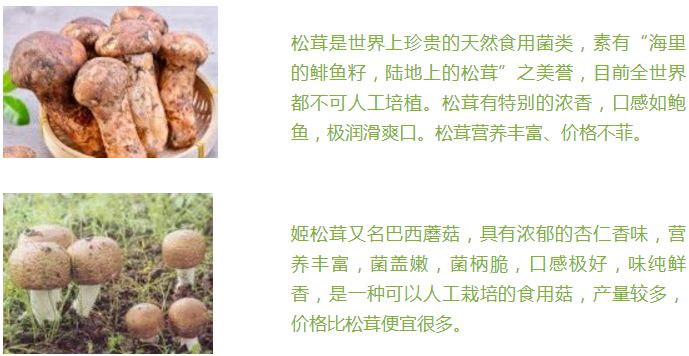 四试口感。松茸口感极润爽滑。姬松茸口感脆嫩。大球盖菇肉质滑嫩柄爽脆。