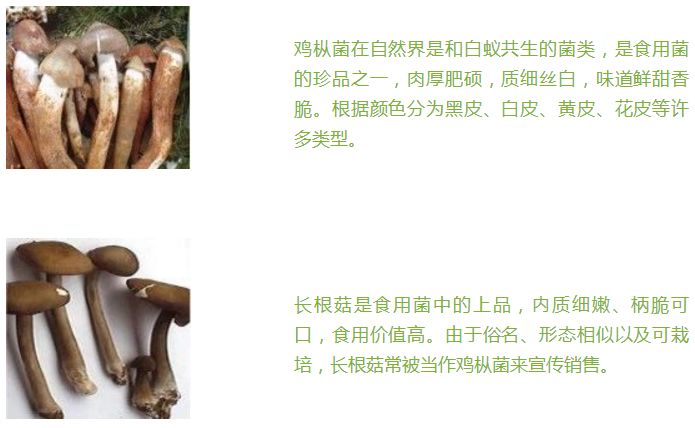 三试手感。鸡枞菌菌肉紧致平实。长根菇肉部纤维质且松软。