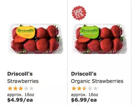 美国水果公司Driscoll's线上售卖普通草莓(左)和有机草莓(右)的价格(普通草莓的评价比有机草莓多半颗星)