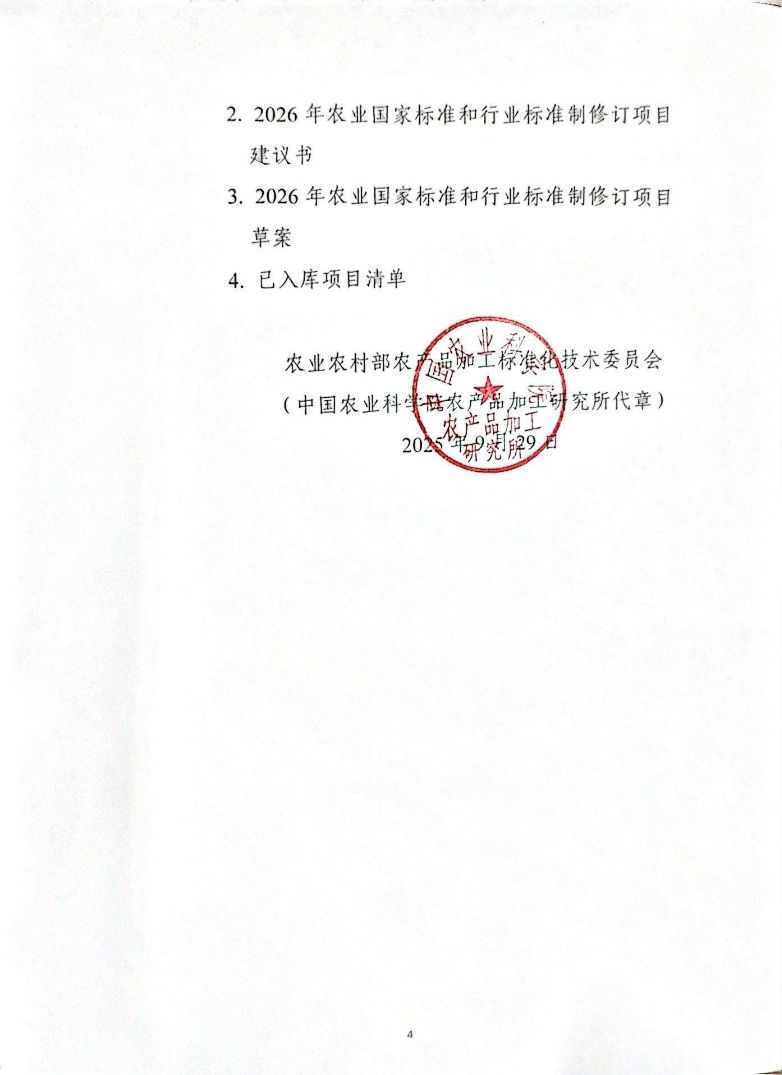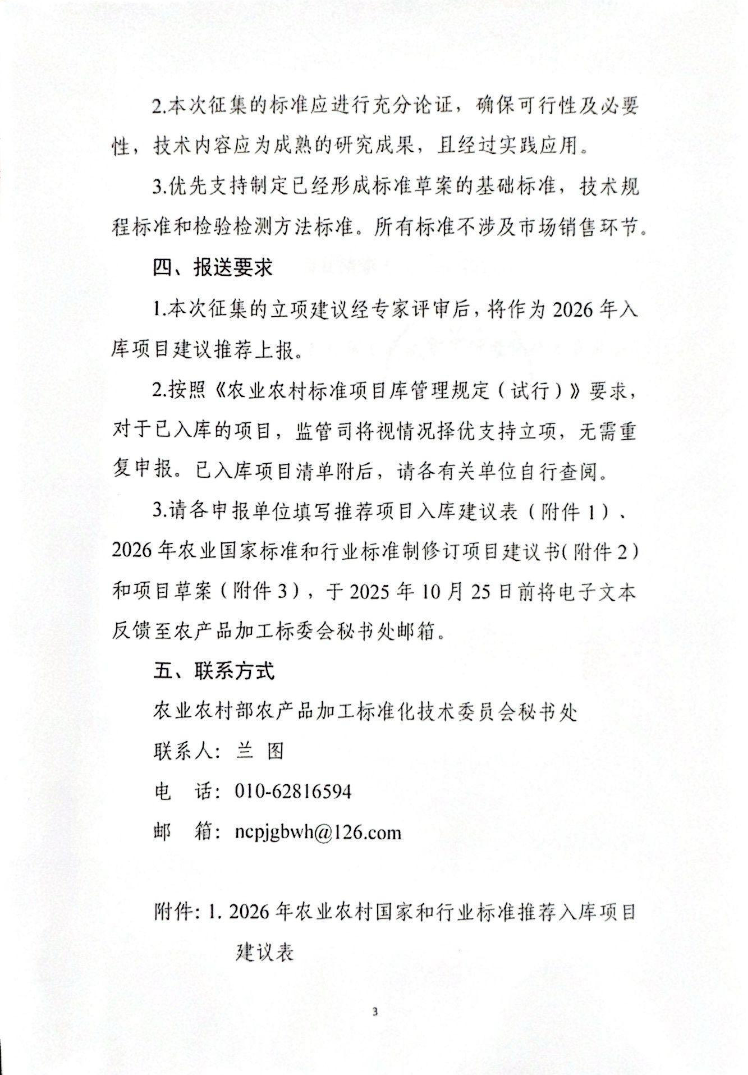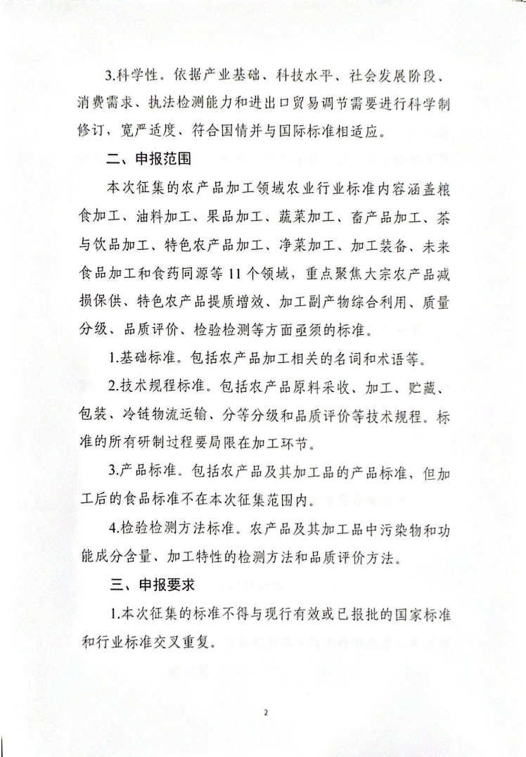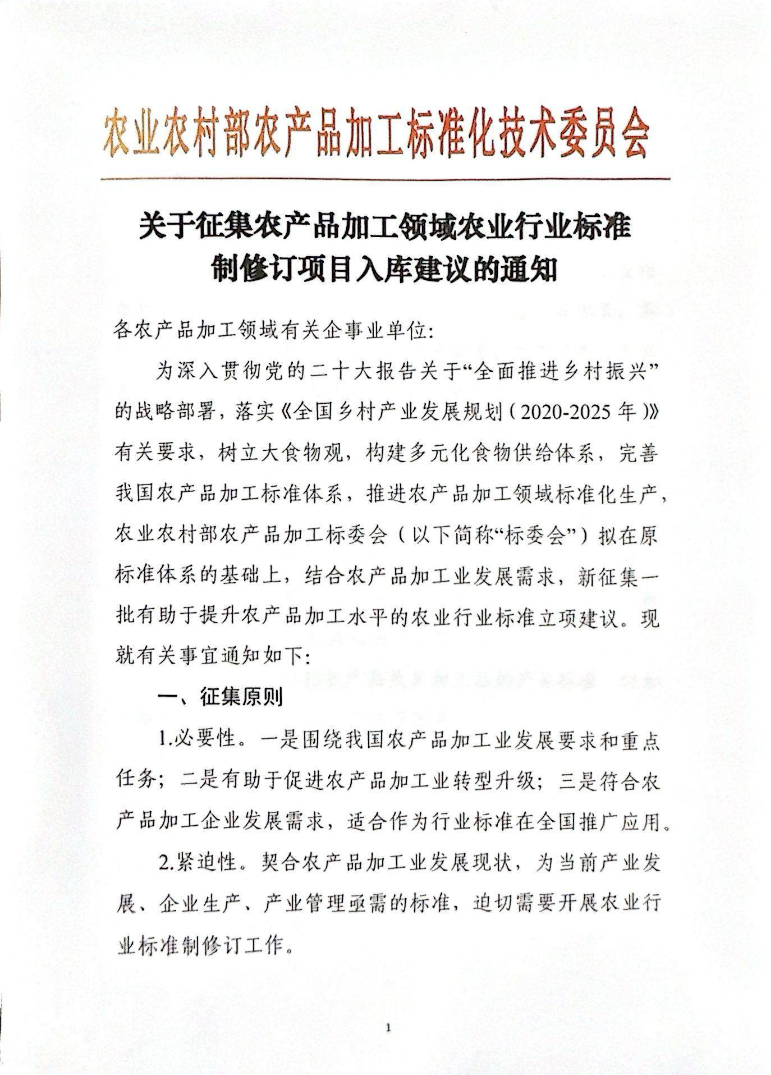 关于征集农产品加工领域农业行业标准制修订项目入库建议的通知