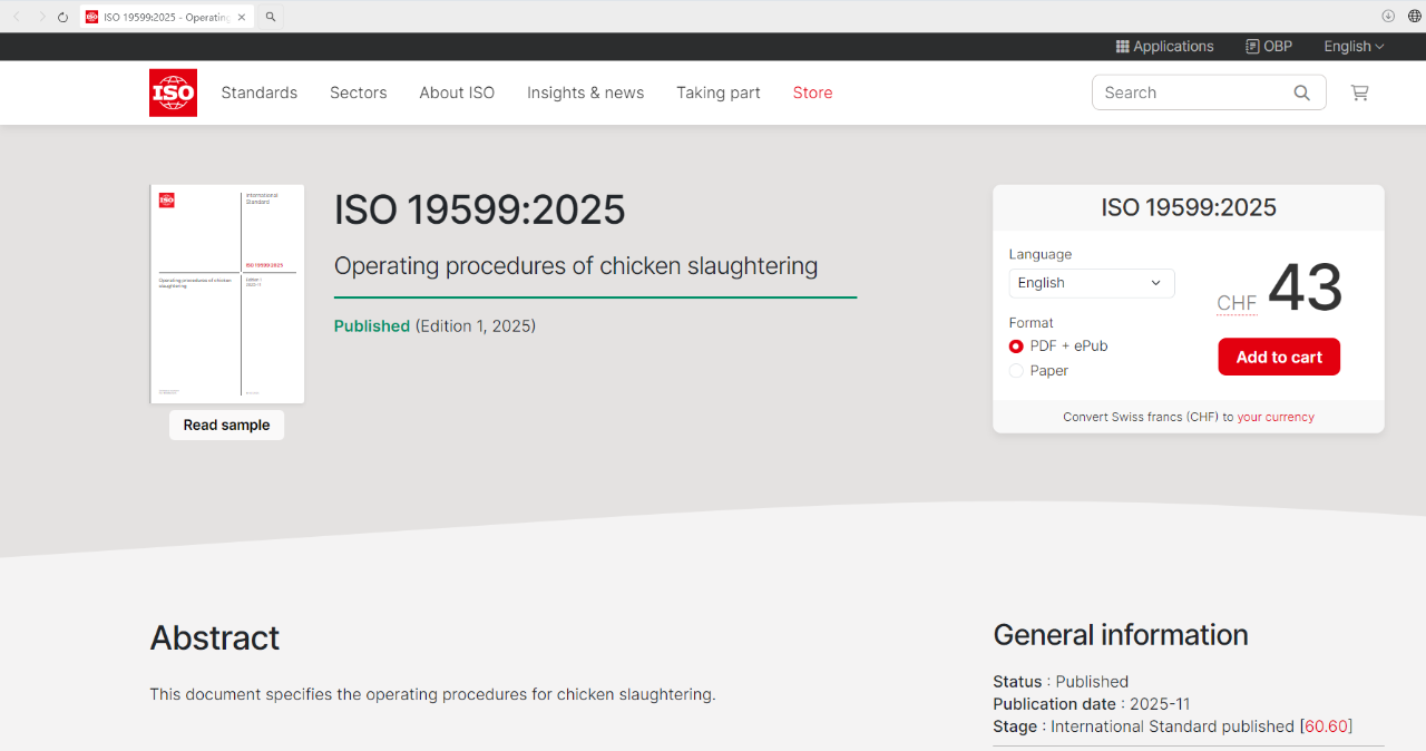 瑞士当地时间2025年11月14日,ISO(国际标准化组织)正式发布国际标准ISO 19599:2025《鸡屠宰操作规程》(Operating procedures of chicken slaughtering)。该标准由全国畜禽屠宰质量标准创新中心牵头起草,是我国第一项家禽屠宰领域国际标准,不仅实现了山东省牵头制订畜牧业国际标准零的突破,更标志着中国畜禽屠宰标准体系正式登上国际舞台,为全球家禽屠宰行业提供了“中国方案”。